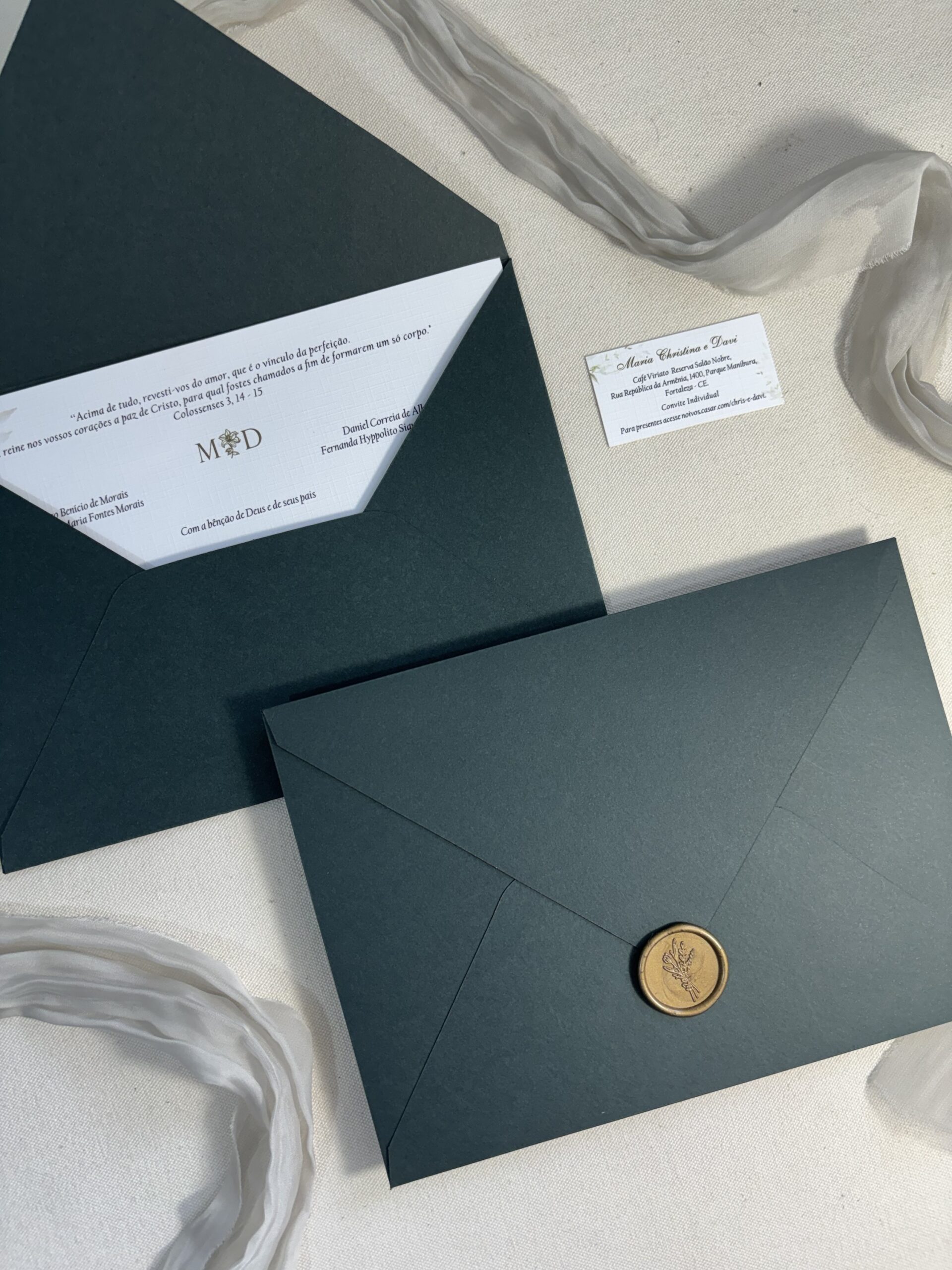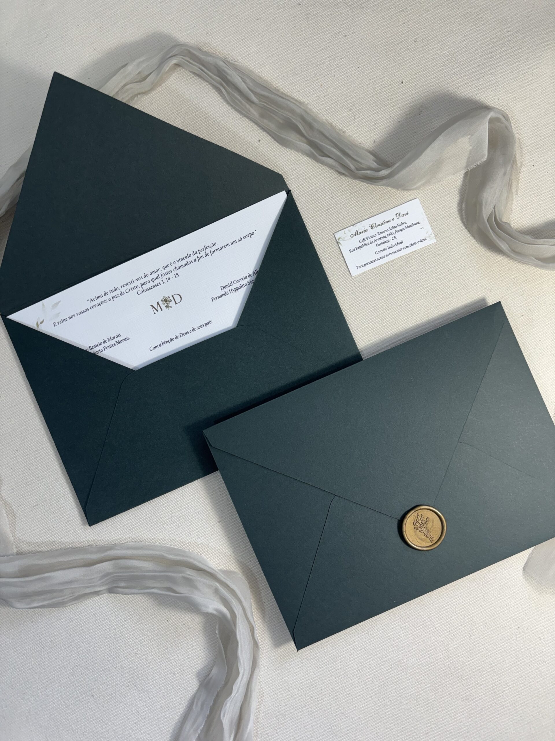 Envelope e convite produzidos em papel especial de alta qualidade, garantindo sofisticação e um acabamento impecável.
